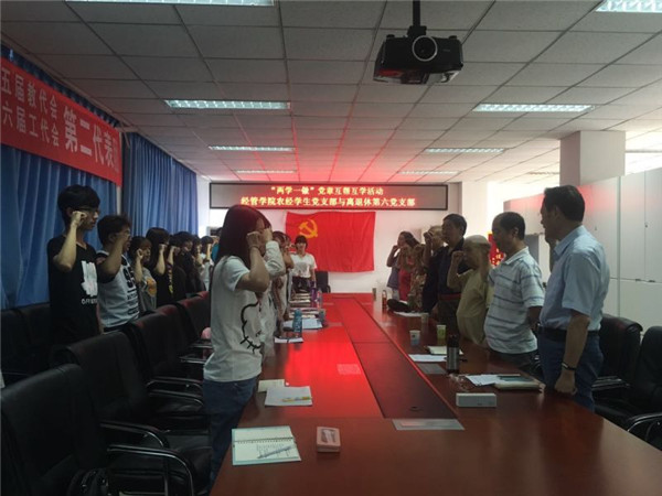会议上,沈文华老师就新形势下如何学习、发展中国共产党进行讲话,并提出要“追求入党,志存高远”。沈文华老师带领大家重温“党章”的总纲部分并举起右拳进行宣誓。两党支部进行互相交流,员工党员和积极分子代表发言,就在入党过程中的感悟和存在的困惑积极提问,离退休支部的胡星池老师、江占民老师、艾启俊老师等回答了员工提问并认真地向同学们讲述了自身的入党经历以及对当下一些热点问题的看法,同学们认真听取,受益良多。离退休支部书记沈文华老师表达了对此次活动取得的良好效果的肯定,并提出希望两支部能长期坚持将活动做下去,会议的最后,赵金芳副经理对本次活动进行总结发言。