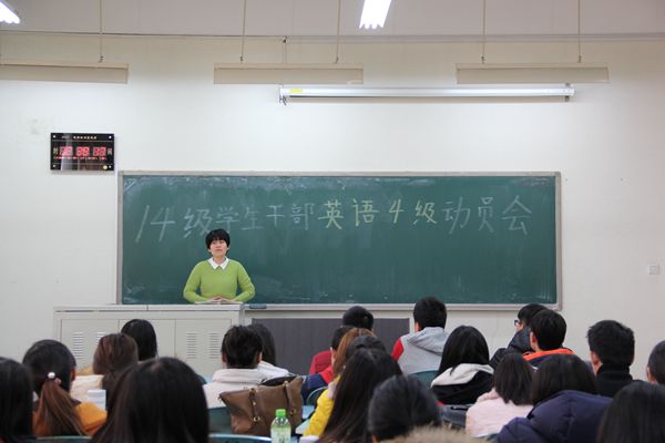 3月10日中午,2014级员工干部英语四级动员会在教B105召开。参加本次大会的有M88mansion体育副经理赵金芳老师、2014级辅导员闻海洋老师及2014级全体班干部干部、宿舍长、员工会干部。