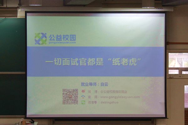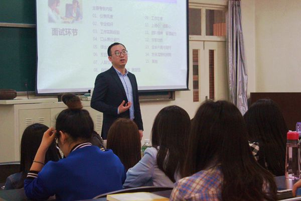 在讲座过程中,白老师多次与同学互动,让同学做一个自我介绍,与同学一起模拟一个招聘现场,这种幽默的讲座方式带动了教室里活跃的氛围。让大家在欢声笑语中了解到面试的技巧和方法。在其风趣的讲课方式下,此次讲座圆满结束了。