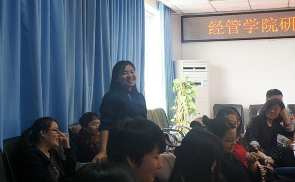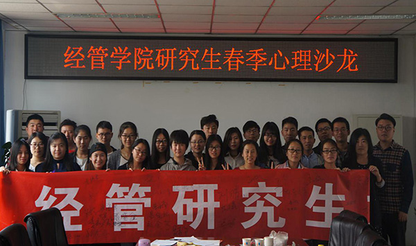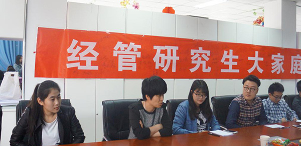 为增加活动的互动性,到场的研究生及老师在经管研会精心准备的“经管研究生大家庭”横幅上签字留念。赵金芳经理结合自己亲身的经历与同学展开真诚的交流,拉开活动的序幕。