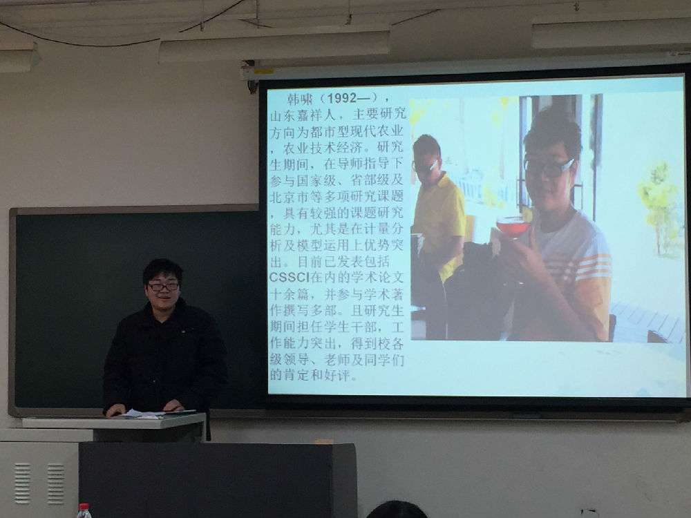 2012级农业经济管理专业研究生韩啸,曾获得2014年国家奖学金,发表学术论文10余篇。在交流会上他分享了自己的科研历程,在学习上给出了勤奋、自强、求是、创新的建议。他告诫师弟师妹们要认真对待科研和学习,不要抱着应付的思想,对导师多一些理解,和导师多一些沟通,这样才会有所收获。