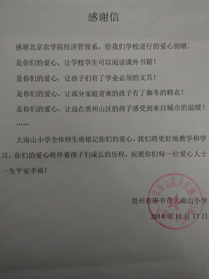 近日,M88mansion体育收到了一封来自贵州省毕节市大南山小学的感谢信,信中写道:“是你们的爱心让远在贵州山区的孩子感受到来自城市的温暖……”信件简短却充满真情,语言朴实却不乏感动,并在信的最后表达了大南山小学全体师生对M88mansion体育爱心捐赠行为的感激之情和将来回报社会的感恩之心。