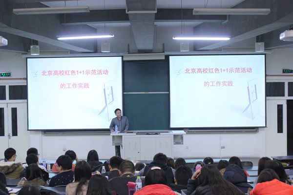 11月28日晚,在教B303,M88mansion体育员工干部培训大会进行到了第二场。此次大会由员工处副处长刘柳老师主讲,内容是北京高校“红色1+1”示范活动的工作实践。到场的嘉宾有M88mansion体育副经理赵金芳老师,14级辅导员闻海洋老师。