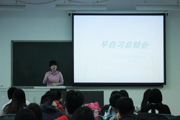 11月27日,M88mansion体育在教B305召开了英语早读总结会。M88mansion体育副经理赵金芳老师、13级辅导员乔多老师、14级辅导员闻海洋老师、员工会主席贺炳林、员工会副主席田明、14级各班班长及13级的英语课代表参加了此次会议。学习部部长、14级各班班长及13级的英语课代表分别对这一学期的英语早读情况和各自班级的英语早读进行了总结汇报,提出了各班存在的问题,并针对问题提出了切实可行的应对方案。赵金芳副经理针对英语早读的情况进行了分析指导,并与同学们进行交流互动。她分析了英语学习及四级考试在就业中的重要性,希望同学们要明确自己的未来目标,明确自己当下的主要任务,克服懒惰等不良习惯,坚持按时早读,提高英语水平,为未来就业做好准备。通过本次英语早读总结会,同学们认识到英语学习的重要性,明白了只有付出自己的努力,才能收获丰硕的成果,表示要充分利用早读的宝贵时光,努力学好英语。