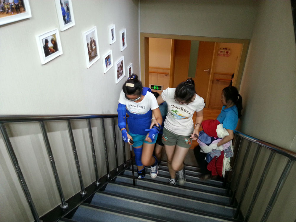 在和工作人员进行了简单的沟通交流,赠送慰问品之后队员们立即投入到了工作当中。为了能更好的体验老年人平时生活的困难与不便,工作人员为团队提供了两套特殊服装,穿上后围绕养老院走一圈,亲身体验年老后肢体的不便和生活的困难。