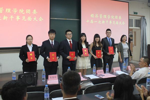 接下来,各部部长依次致辞、宣读新干事名单,展现了新鲜血液的勃勃生机,新干事气势恢宏的宣誓更是将会议推向高潮。在斗志昂扬的氛围下,辅导员闻海洋老师对于员工会新成员的加入表示了祝贺,同时对于员工会的未来建设提出了几点要求并与员工会主席团合影留念。