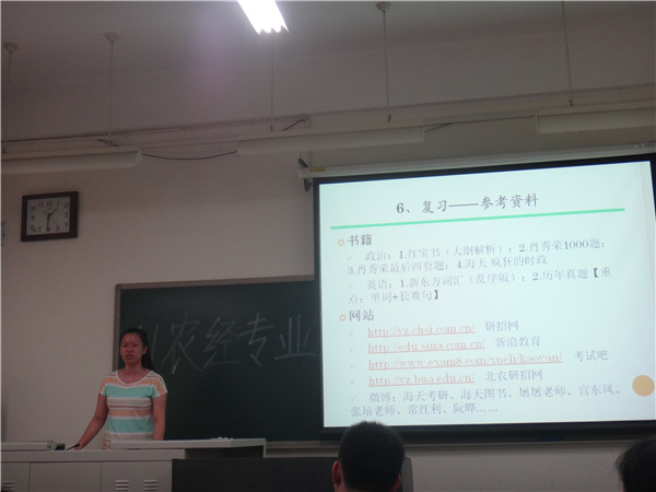 首先,陈娆老师对11级农经专业四年级的发展方向做出了总体的规划,并鼓励同学们为毕业后发展早作准备、积累知识经验。随后,10级农经专业的高伸、赵春宇、徐月华、宗佩佩、高可心、朱满阳等同学上台,结合各自的就业或考研经历,分别讲述了考公务员、进公司、考村官以及硕士生笔试、面试、调剂等多方面的感受和经验,并对11级同学提出的疑问做了详尽的解答,为11级同学的发展提出了建议。