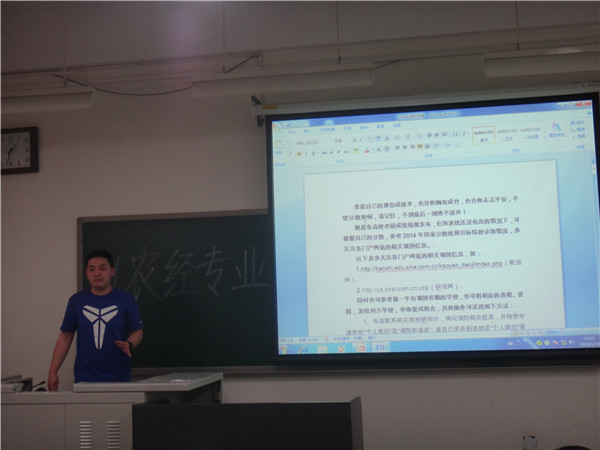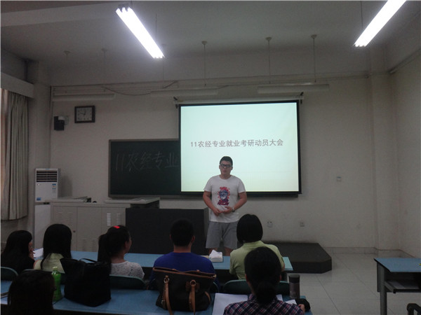 2014年6月,又迎来每年一度的毕业季。为响应公司和公司积极促进毕业生就业的号召,农经系于5月29日在教B305召开了“11农经专业就业考研动员大会”主题班会。班会由班主任赵海燕老师主持,农经系系主任陈娆老师、10级农经专业毕业生高可心等6位学长代表、11农经专业全体同学参加了此次活动。