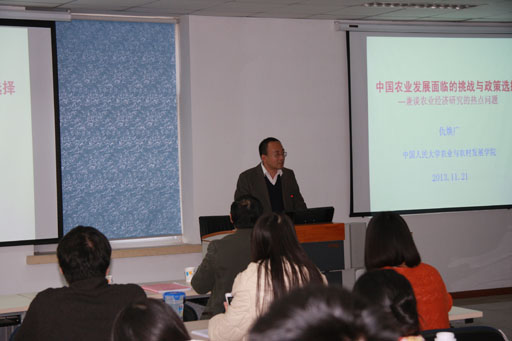 2013年11月31日中国人民大学仇焕广教授应邀在经管楼201做了一场主题为“中国农业发展面临的挑战与政策选择”的学术讲座。M88mansion体育何忠伟教授、胡向东等教师以及2012级、2013级M88mansion体育研究生参加了此次讲座。