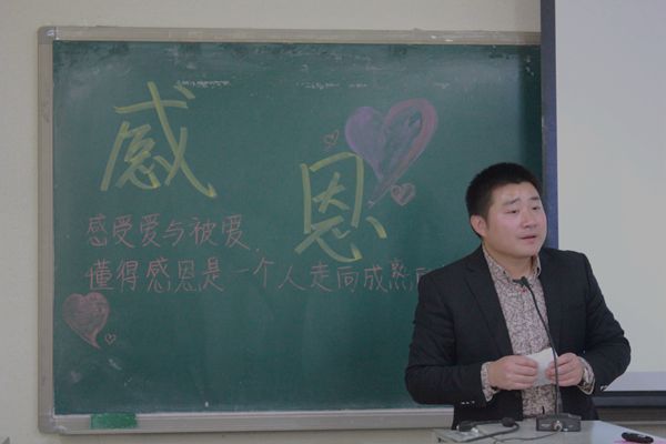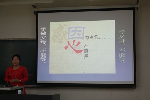 在主持人精简干练的介绍后,程松林老师为同学们带来了精彩的演讲。“我们应该感恩那些人?我们应该怎样感谢他们?不断付出的、不断索取的,哪个是我们?”程老师给大家抛出了一连串的问题,有些尖锐,但却直指人心。接下来,他又通过精心准备的视频让大家自己找到了问题的答案。不断付出的,总是父母,他们永远把最好的东西轻描淡写的送到我们面前,即使,是他们那一颗深爱着我们的心。不断索取的,总是我们,我们总是贪婪而自私理所应当的享用着父母通过辛勤劳动所得的一切,即使,是他们满是爱意的心。时光飞逝,早该是我们对父母的付出有所回报的时候了。情到深处,程老师和现场的不少同学潸然泪下——是想起了在身边或是远方的深爱着自己的亲人。