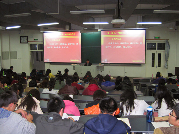 11月3日晚,M88mansion体育分党校2013年党课初级班培训在教学楼B303继续进行。此次党课,特邀了学工部韩宝平部长为学员们做了主题为《中国共产党员的标准》的讲座,公司党总支副书记赵金芳老师、辅导员李国政老师、各专业员工党支部书记及以2013级新生为主体的入党积极分子200余人参加了此次党课学习。