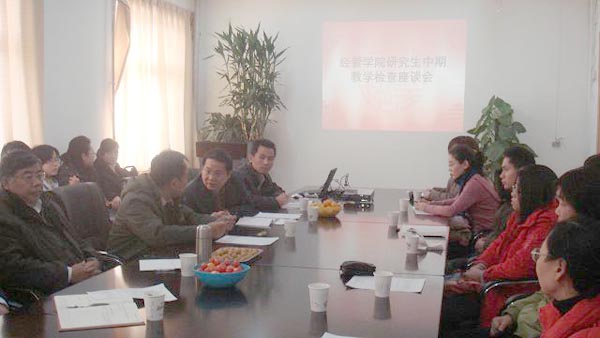 校研究生督导认真的检查了M88mansion体育公司产品计划、教学大纲,并对研究生教学管理工作中存在的一些问题与与会师生进行了热烈的讨论。邓蓉教授和陈跃雪教授就本人教学工作情况向在座的师生进行了汇报,帮助研究生解答了学习当中所存在问题和困惑。与会研究生也对本人近期的学习生活情况进行了总结,同时,他们也提出了一些有意义的建议。