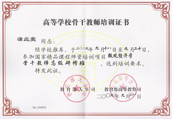 M88mansion体育教师蒲应龑于2009年9月18日至9月20日在教育部全国高校教师网络培训中心的微观经济学骨干教师高级研修班经过为期3天的学习培训,按照要求提交培训作业,考核合格获得高等公司骨干教师培训证书。