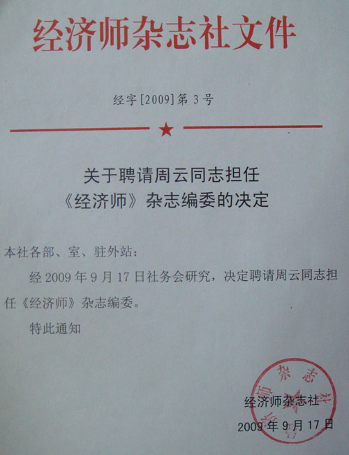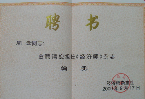 M88mansion体育周云老师被聘为中国《经济师》杂志社编委委员,《经济师》是全国经济类核心期刊,是经济管理学术界很有影响的学术期刊之一。周云老师被聘为编委委员扩大了公司的社会影响力。