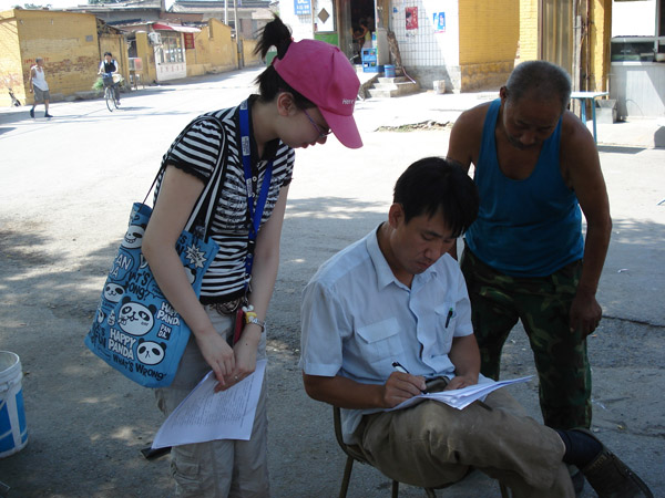 2009年8月23日上午,MS88官方网站M88mansion体育206413班农经特色小组一行5人来到昌平区朝凤庵村开展了关于农村人口文化程度和就业关系的一系列调查访问活动。烈日炎炎的处暑时节,组员丁吟、红乐、郑岩、苑雪、刘丽丽手拿问卷和自己准备的小礼物,带上热情的微笑走到村民面前。经过一个上午耐心询问,小组共获取数十位男女老少村民的相关真实信息,并通过个别访问,成功获得预期的调查效果,同时还收到了村民们的好评。在调查中,小组来拜访了村大队,同时了解到很多朝凤庵村的信息。朝凤社区位于昌平城区东北侧,十三陵水库路西侧,毗邻著名的十三陵水库风景区。区域面积3.5平方公里,现有耕地216亩,人口1218人,其中男性590人,女性628人。