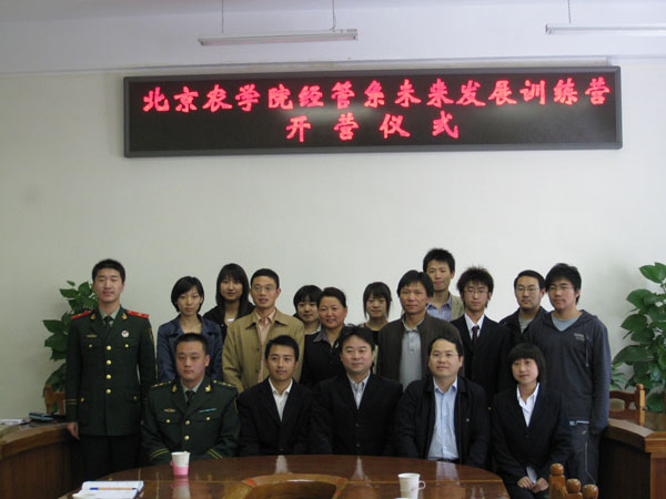 2008年10月15日上午10:30,MS88官方网站经济管理系未来发展训练营举行了开营仪式,员工处处长韩宝平老师参加并致辞,对训练营的成立和发展寄予厚望;系主任何忠伟老师针对训练营作为员工第二课堂的性质提出了做出特色、做出品牌、做出时效的目标及要求;未来发展训练营的营长杨芳同学对训练营的工作方向、性质意义及定位作了工作汇报;最后由员工处处长韩宝平老师和团委书记杨宝东老师为训练营举行授牌仪式,除此之外,参加开营仪式的还有经管系副主任刘柳,人文社会科学系副主任张彦敏,食品科学系副主任李相阳,动物科学系副主任靳晶,以及回龙观消防中队副队长-杨队长和郑班长。