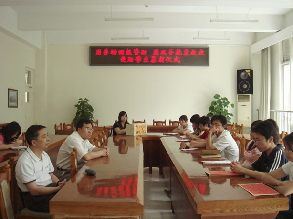 2008年5月27日下午,由经济管理系与员工处勤工助学中心联合发起的“用劳动回报资助,用双手抗震救灾”受助员工募捐仪式在教B-209举行。员工处副处长张国柱,团委书记杨宝东,校医院张经理出席了此次捐赠仪式。