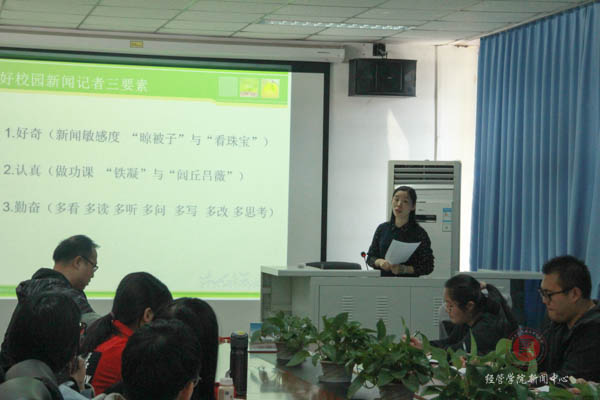最后张老师重点讲解了校园新闻写作。校园新闻写作以活动和会议题材为主,但无论哪种题材,时间、地点、活动以及会议名称是必不可少的,对于新闻记者来说,活动会议前的准备工作更是重中之重。
