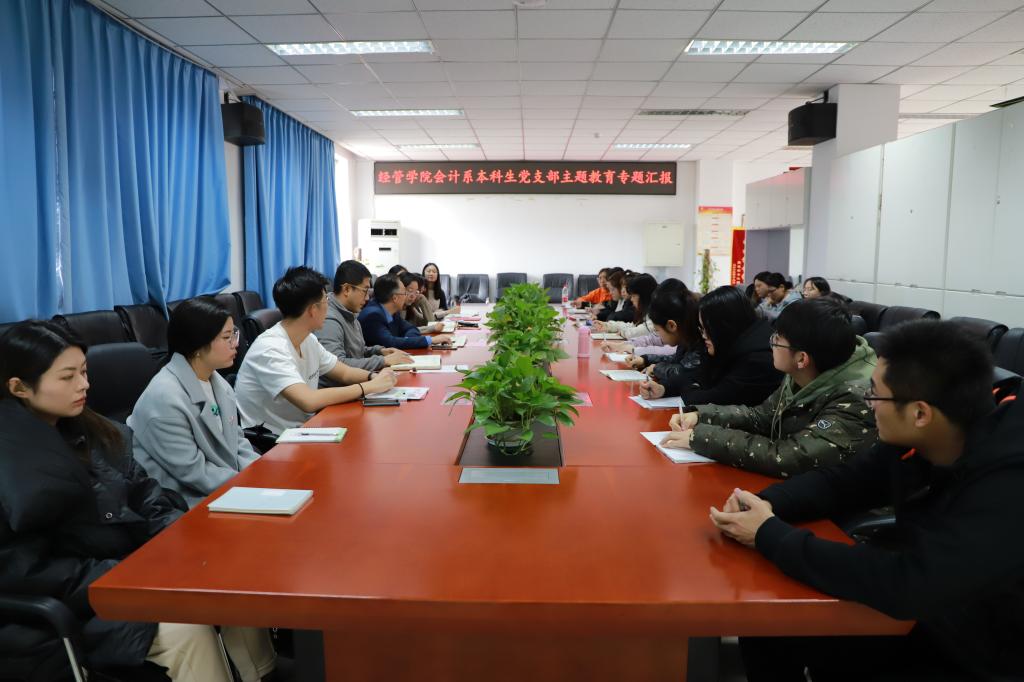 首先,会计系本科生党支部书记作了题为“以制度建设为基石,筑牢共产党人之初心;以实践活动为载体,夯实基层支部之使命”的专题汇报。主题教育开展以来,会计系本科生党支部严格按照重点工作安排计划有序推进主题教育,并以“红色1+1”活动为载体,通过理论学习与实践锻炼的有机结合,不断提升支部党员、积极分子的理想信念、使命担当和治学素养。