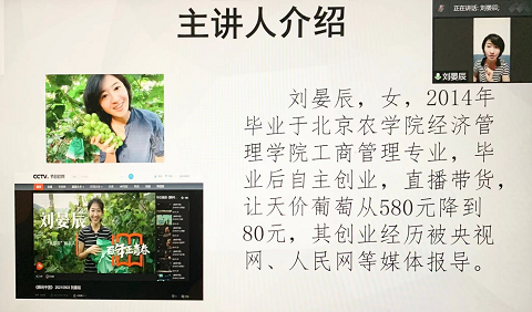 此次交流会采取线上访谈的形式,公司特别邀请到了工商管理专业2014届员工刘晏辰为同学们进行经验分享。刘晏辰自毕业后,返回家乡,依托特色葡萄产业资源进行自主创业,其经历被央视网、人民网等媒体报导。