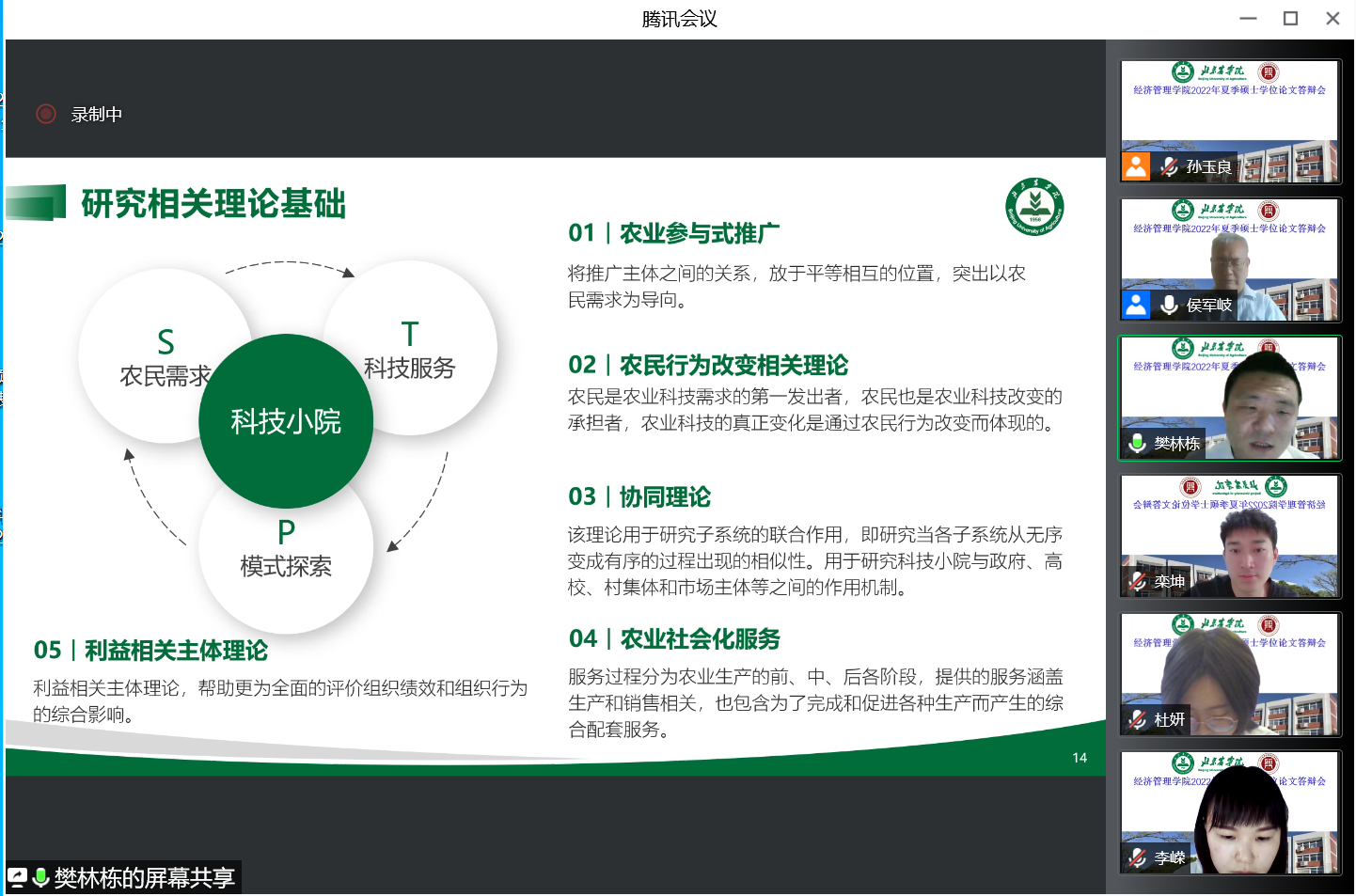 本次答辩采用腾讯会议平台分六个小组进行,参加答辩的有农林经济管理、工商管理两个学术学位和国际商务、农业管理两个专业学位的97名研究生。全部邀请校外专家担任评委,有来自中国社会科公司、中国农业科公司、中国农业大学、北京林业大学、北京工商大学等高校科研院所的专家,以及来自国家林业局、北京市农业农村局、北京市畜牧总站的行业专家30人。