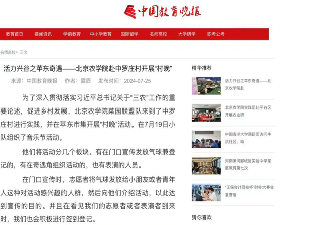 7月19日菜园联盟队在中罗庄村举办了“桃梦音符-平谷音乐奇遇记”主题活动,将苹东集市打造成一个集娱乐、购物、文化体验于一体的乐园,提升了市集的吸引力和游客的参与度。此次活动的成功举办,不仅获得了村民和游客的好评,还受到《中国教育晚报》的关注与报道,扩大了平谷苹东市集的知名度与影响力。