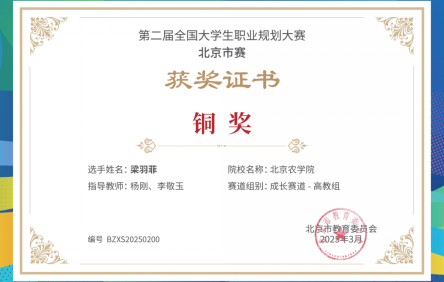 智启新程,赛场砺锋。在本科生科研训练项目方面取得进展,近期有3项项目成功立项。这些项目涵盖了经管领域的多个热点和前沿问题,员工们在项目中积极探索、勇于创新,展现出对学术研究的浓厚兴趣和扎实的研究能力。在第二届全国老员工职业规划大赛的舞台上,2023级农经1班梁羽菲同学以“心怀家国志,规划致未来”为航标,将专业知识与职业理想深度融合,以清晰的自我认知、科学的路径规划、务实的实践成果脱颖而出,荣获北京市高教组铜奖。