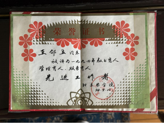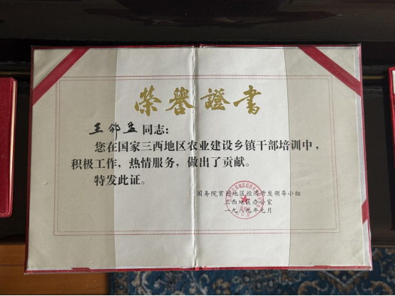 王邻孟教授获得国务院贫困地区经济开发领导小组颁发的荣誉证书