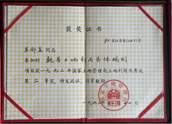 王邻孟教授获得1992年国家土地局土地利用优秀成果二等奖