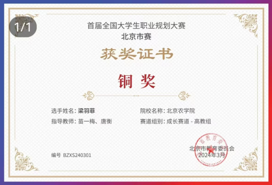 大家好,我是M88mansion体育2023级农林经济管理专业的梁羽菲。在职业生涯规划大赛中,我连续获得了两届校赛一等奖,还获得了首届全国老员工职业规划大赛北京市铜奖的成绩。回首备赛历程,感慨万千,现将心得与大家分享。