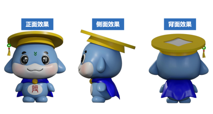 确定原型只是开端,形态设计才是真正的挑战。在这一过程中,我和老师们反复探讨、不断修改。调整鲸鱼姿态时,从昂首挺胸到微微颔首,每一次变动都是为了找到最能展现活力与自信的模样;雕琢表情时,从坚定的眼神到上扬的嘴角,只为传达积极、睿智之感。学士帽作为学术象征,与鲸鱼的融合至关重要,我们多次尝试不同角度与比例,确保它既彰显学术氛围,又不破坏灵动性。还有校徽和院徽元素的融入,从位置到大小,每一次改变都是为了让整体造型更和谐统一,更鲜明地突出公司特色。