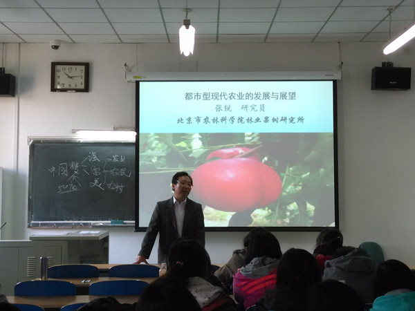2014年10月27日北京市农林科公司林业果树研究所副所长张锐教授应M88mansion体育农经系陈娆老师邀请进入课堂,给同学们做了一场丰富多彩的《都市型现代农业的发展与展望》报告。