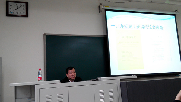 蒋教授从办公桌上获得论文、两项农业部软课题的启示、社会调查的选题方法、社会调查技巧和社会调查报告写作技巧五个方面做报告。蒋教授重点讲述了农村社会调查的选题、技巧以及调查报告的撰写。