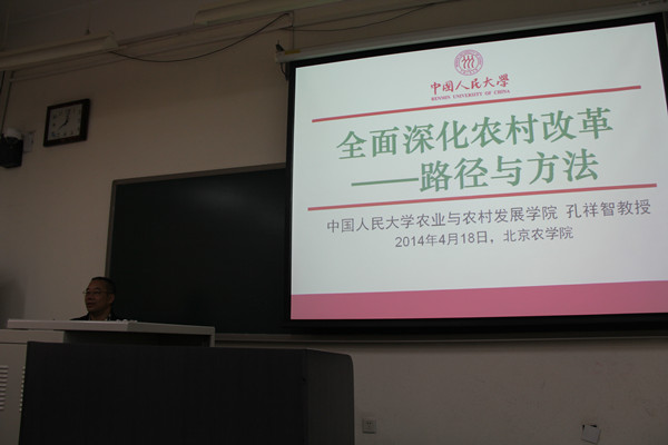 孔祥智教授报告的题目是全面深化农村改革—路径与方法。整个报告围绕三个问题展开讲解:农村改革的总体思路,赋予农民更多的财产权利,加快构建新型农业经营体系。孔教授分别通过十八届三中全会、十八大报告、十六届四中全会、十七届三中全会、2013年中央一号文件、2014年中央一号文件分析上述的三个问题。讲座现场气氛热烈,同学们认真聆听并积极参加讨论,报告取得很好效果。