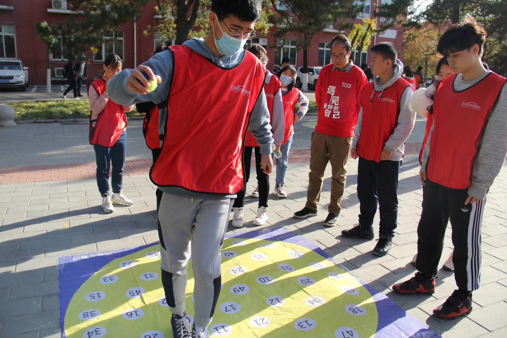 平复了第一关激动的心情,带队老师带领员工进行了第二个项目——数字城堡。看着地上充满杂乱数字的地毯,同学们因困惑而蹙起的眉头在老师清晰的讲解下渐渐舒展,地毯上的挑战者需要拿着两个球中的一个按顺序依次踩数字而避免猜到其他数字。练习最初进行地很顺利,但随着数字的叠加渐渐出现了两个数字的位置间隔很远的情况。要发挥男生腿长的优势冒险跳过去踩吗?但一次次无法避免的“越界”提示着大家也许应该换一种思路,站在地毯另一侧的女生配合着踩上了这个数字。