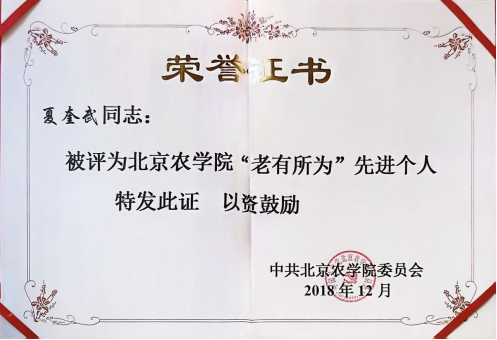 2018年 夏奎武老师被评为MS88官方网站“老有所为”先进个人