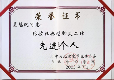 2003年 夏奎武老师荣获“防控非典型肺炎工作先进个人”称号