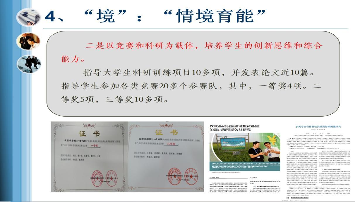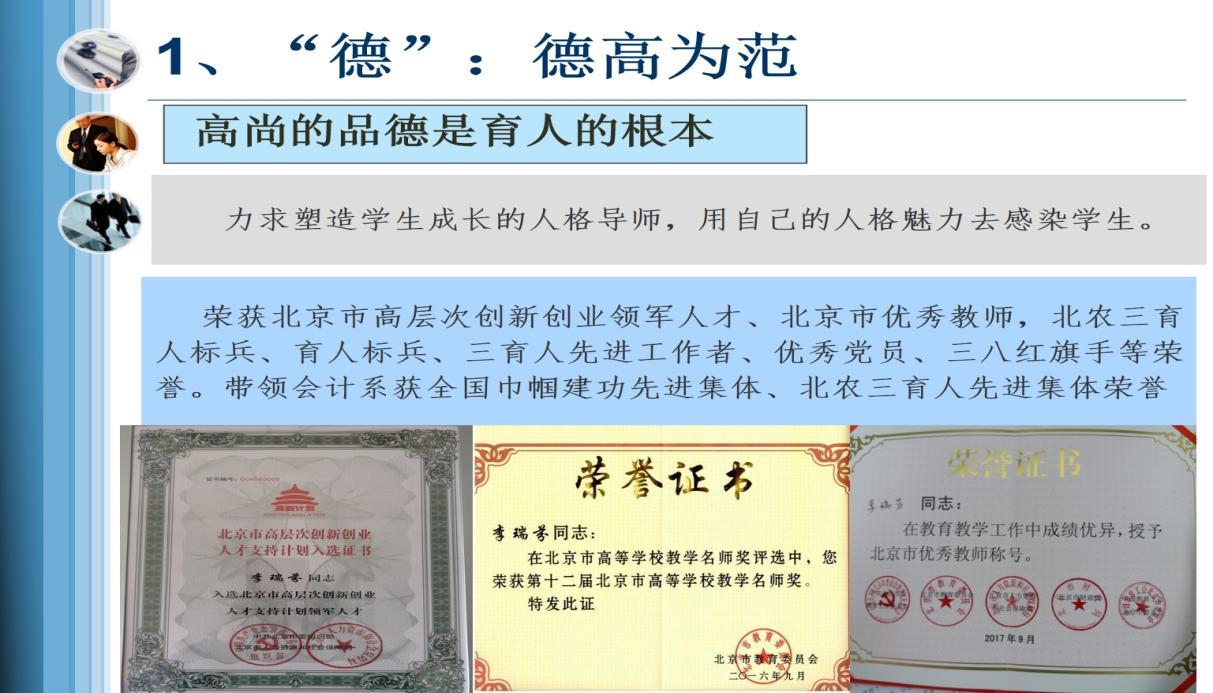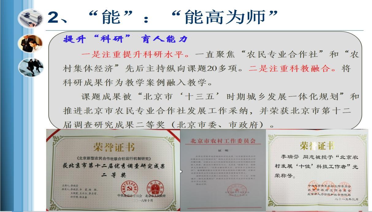 作为会计学专业的“守门人”,她将《会计学原理》这门入门课程,视为“入门育素养”的关键一环。她带领课程团队,将其建设成为北京市课程思政示范课程和优质课程,配套教材亦获评优质,为员工扣好了专业学习的第一粒扣子。她的讲台不止于校园,多年来,她将研究目光聚焦于京郊大地的“农民专业合作社”与“农村集体经济”,主持各级课题20余项。她的研究成果多次被北京市相关规划与政策文件采纳,荣获北京市调查研究成果二等奖,一些对策建议更被《成果要报》《首都咨政》等内参选登,真正实现了将论文写在京郊大地上的承诺。她也因此被授予“北京市农村发展十佳科技工作者”等称号。这些来自田野的、鲜活的科研案例,被她巧妙地反哺于课堂,让员工在掌握理论知识的同时,也触摸到中国乡村发展的真实脉搏。