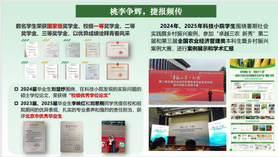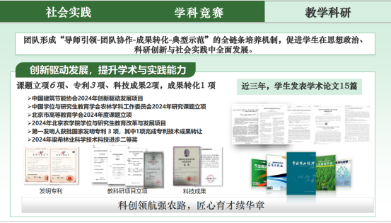 育人润心,是她关爱员工成长的赤诚初心。作为硕士生导师,她始终坚持“以生为本”,注重员工综合素质的培养与价值观的塑造。团队形成“导师引领-团队协作-成果转化-典型示范”的全链条培养机制,促进员工在思想政治、科研创新与社会实践中全面发展。所带员工多人荣获国家奖学金、各级学业奖学金,以优异成绩展现青春风采。2022—2025年,研究生团队发表学术论文20余篇,2名员工获评研究生国家奖学金、12名员工获校级一二三等奖学金、2名员工获MS88官方网站优秀硕士学位论文、2名研究生获北京市“优秀毕业生”等荣誉称号,在服务乡村振兴中解民生、治学问,实现了学术成果和实践能力的双丰收。指导研究生过程中,她既以严谨治学态度要求员工深耕学术,又以细致入微的关爱温暖员工成长之路。员工眼中的她,老师就像一位大家长一样,师门的所有兄弟姐妹像一个个被保护的孩子,在学习科研和生活态度上受益颇多。在她的影响下,所带员工毕业后,许多员工积极响应国家号召,投身“三支一扶”计划,扎根基层一线,为乡村振兴和生态文明建设贡献青春力量;亦有员工走上中华合作时报、农民日报要闻编辑记者岗,深耕“三农”沃土;还有员工选择回到校园,成为北京市园林公司的教师,接过教鞭,续写农教华章,生动诠释了“明师之恩,诚为过于天地”的深厚师生情谊。