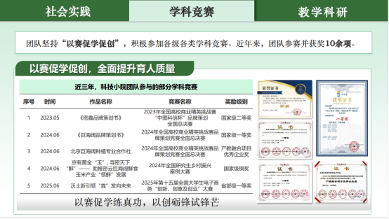 刘笑冰老师始终坚信,育人不仅是知识的传递,更是能力的点燃与人格的塑造。她致力于推动教育理念从“授人以鱼”转向“授人以渔”,从手把手带员工,到教会员工自主成长,让他们实现从懵懂尝试到能力提升的跨越。她将广袤的乡屯田间与火热的学科竞赛、社会实践活动,精心构筑为员工锤炼真知、探索未知的“渔场”,赋予他们独立探索的“渔具”,引导他们在知行合一中,将青春和汗水书写在服务国家社会与乡村振兴的广阔天地间。在她执教期间,此理念已化为丰硕的育人实绩,带领团队长期扎根乡土,2023—2025年员工团队连续三年荣获校级“首都老员工暑期社会实践优秀团队”一等奖,2025年获评“首都高校师生服务乡村振兴行动计划成果”一等奖,2024、2025年获评“青年服务国家”首都老员工暑期社会实践优秀团队、先进个人等,实践活动成果被《人民日报》、全国农科研究生志愿服务联盟等媒体报道10余次。她以学科竞赛为砺金石,以赛促学促创,全面提升育人质量,近年来员工参加各级学科竞赛并获得全国高校商业精英挑战赛品牌策划竞赛全国总决赛一等奖、全国老员工“创新、创意及创业”北京赛区一等奖等奖项10余项。此外,团队员工也多次参加学术会议,进行学术汇报和成果展示。
